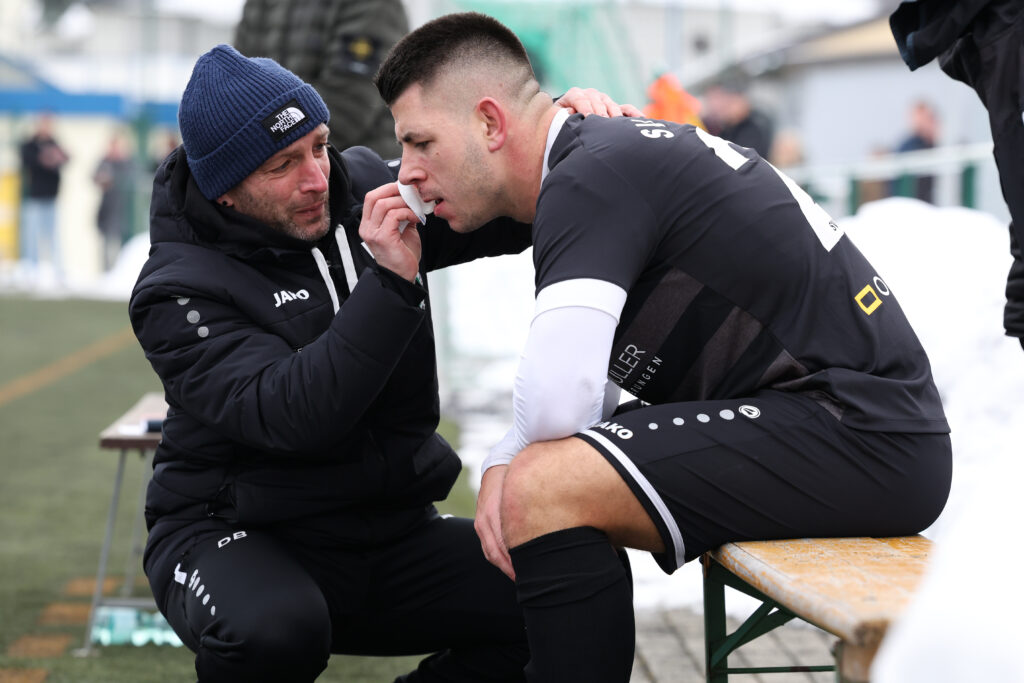 Denny Buschner (Co-Trainer SV Merkur Oelsnitz, links) versucht die Blutung von Toni Döges Oberlippe zu stoppen. Wenige Minuten vorher riskierte Döge Kopf und Kragen und brachte Oelsnitz in front.